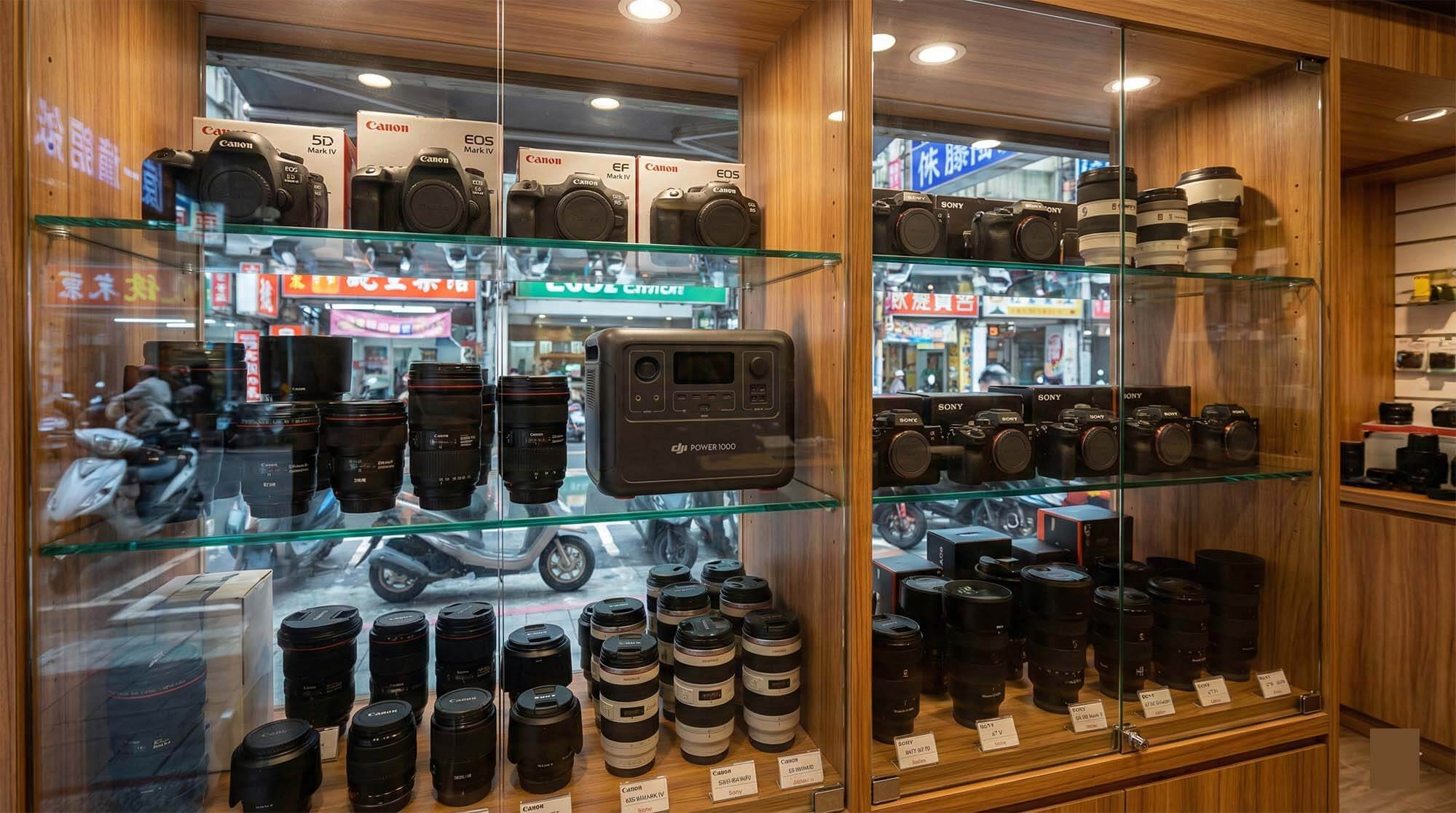 二手相機店的玻璃展示櫃中,除了單眼相機與鏡頭外,還陳列著一台 DJI Power 1000,象徵多元收購 (Inside a used camera store display case, alongside DSLR cameras and lenses, a DJI Power 1000 is displayed, symbolizing diverse buyback options).